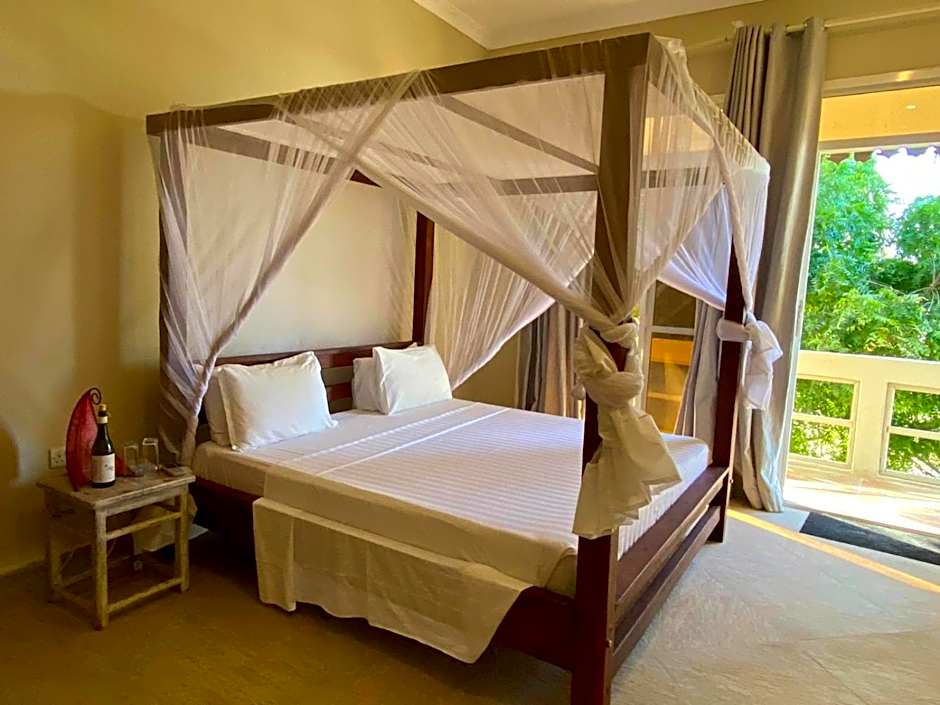 Deluxe Double Room Deluxe pool side double room. This air-conditioned, ground floor room features a large king sized bed and has a small drinks fridge, safety deposit box and tea making facilities. The private bathroom has double sinks, hairdryer and both room & pool towels provided. There is a front terrace with seating and views of the pools and the sea beyond that.